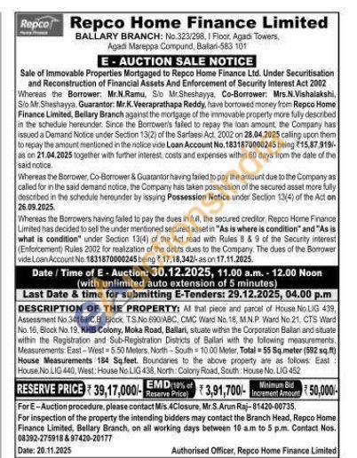 DESCRIPTION OF THE PROPERTY: Al that piece and parcel of House. No.LIG 439. Assessment No.34169/C,B. Block. TS.No 690/ABC, CMC Ward No. 18, M.N.P. Ward No. 21. CTS Ward No. 16, Block No.19, KHB Colony, Moka Road, Ballari, situate within the Corporation Ballan and situate within the Registration and Sub-Registration Districts of Ballari with the following measurements Measurements: East-West 5.50 Meters, North-South 10:00 Meter, Total55 Sq.meter (592 sq.ft) House Measurements 184 Sq. feet. Boundaries to the above property are as follows: East House No LIG 440, West: House No LIG 438, North: Colony Road, South: House No. LIG 452