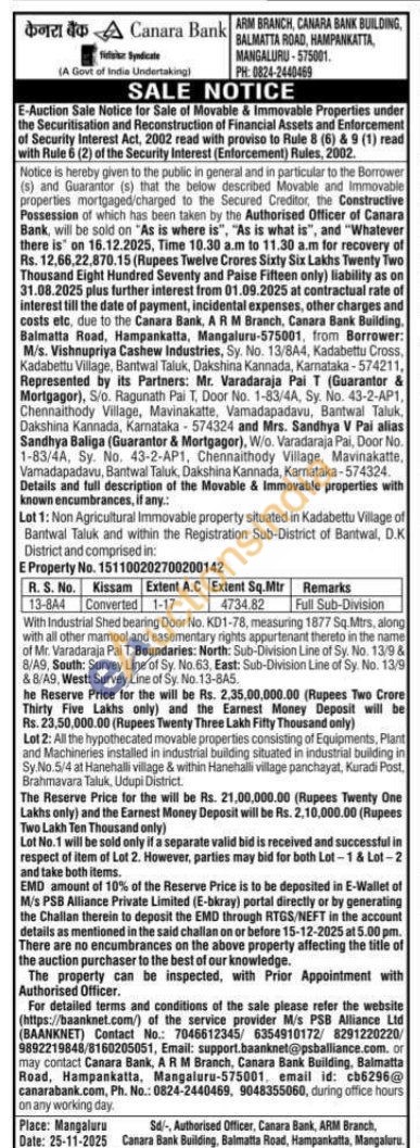 Lot 2: All the hypothecated movable properties consisting of Equipments, Plant and Machineries installed in industrial building situated in industrial building in Sy.No.5/4 at Hanehalli village & within Hanehalli village panchayat, Kuradi Post. Brahmavara Taluk, Udupi District.