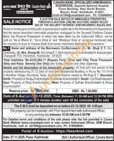 Details and full description of the immovable property: All that part and parcel of the property admeasuring 37.72 ares of land and Residential Building in Re.sy No 111/TATA in Koothali Village, Koyilandy Taluk, Kozhikode District owned by Mr.Shaji E T. Bounded: North: Property of Shaiju Eranthottathil & Sathian Eranthottathil South: Cut Road Idavazhi East: Property of Shaji Eranthottathil West: Property of Sathian Eranthottathil & Shaiju Eranthottathil