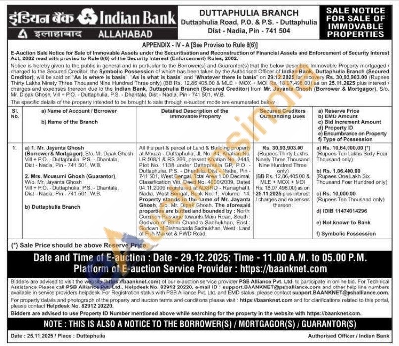 All the part & parcel of Land & Building property at Mouza - Duttaphulia, JL No. 84, Khatian No. LR 508/1 & RS 266, present Khatian No. 2445, Plot No. 1138 under Duttaphulia GP, P.O. Duttaphulia, P.S. Dhantala, Dist-Nadia, Pin-741 501, West Bengal, Total Area 1.00 Decimal, Classification Viti, Deed No. 4600/2009, Dated 04.11.2009 registered at ADSRO-Ranaghatll, Nadia, West Bengal, Book No. 1, Volume 14. Property stands in the name of Mr. Jayanta Ghosh, S/o. Mr. Dipak Ghosh. The aforesaid properties are butted and bounded by: North: Common Passage towards Main Road, South: Godwon of Bhim Chandra Sadhukhan, East Godown of Bishnupada Sadhukhan, West: Land of Fish Market & PWD Road.