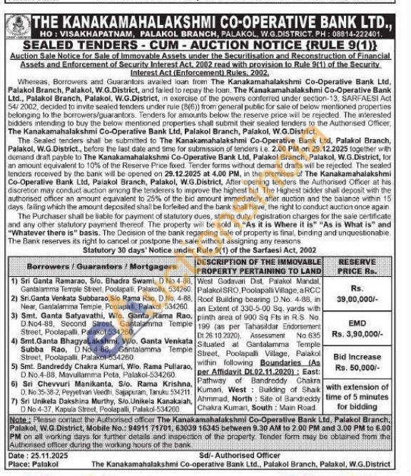 West Godavari Dist, Palakol Mandal, PalakolSRO, Poolapalli Village, a RCC Roof Building bearing D.No. 4-88, in an Extent of 330-5-00 Sq. yards with plinth area of 900 Sq Fts in R.S. No. 199 (as per Tahasildar Endorsement Dt 26.10 2020), Assessment No 635 Situated at Gantalamma Temple Street, Poolapalli Village, Palakol within following Boundaries (As per Affidavit Dt.02.11.2020): East: Pathway of Bandreddy Chakra Kumari, West Building of Shark Ahmmad, North: Site of Bandreddy Chakra Kumari, South: Main Road