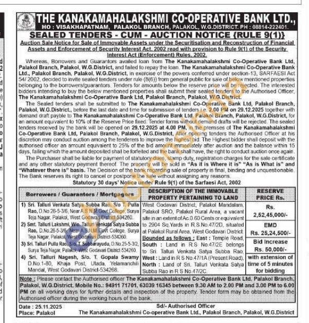 West Godavari District, Palakol Mandalam Palakol SRO, Palakol Rural Area, a vacant site in an extent of Ac 0 60 Cents or equivalent to 2904 Sq. Yards in RS No 47/2D, situated at Palakol Rural Area, West Godavari District Bounded as follows; East: Temple Road, , South Land in RS No.47/2E belongs to Sri. Talluri Venkata Satya Subba Rao West: Land in RS No 47/1A (Present Road), North: Land of Sri. Talluri Venkata Satya Subba Rao in RS No. 47/20