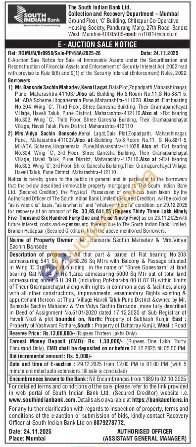Description of property: All that part & parcel of Flat bearing No.303 admeasuring 541 Sq Ft ie 50.26 Sq Mtrs with Balcony & Passage situated in Wing 'C',3rd Floor of building in the name of "Shree Ganesham" at land bearing Gat No.34, H No.1, area admeasuring 5000 Sq Mtr out of total land admeasuring about 6 H 39 R (including Potkharaba 00 H 87 R) within limits of Theur Grampanchayat along with rights in common areas & facilities, along with all other constructions, improvements, easementary Rights existing & appurtenant thereon at Theur Village Haveli Taluk Pune District & owned by Mr. Bansode Sachin Mahadev & Mrs. Vidya Sachin Bansode, more fully described in Deed of Assignment No.5101/2020 dated 17.12.2020 of Sub Registrar of Haveli No.6 & plot bounded on, North: Property of Subhash Kunjir, East: Property of Yashwant Pathare, South: Property of Dattatray Kunjir, West: Road