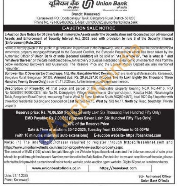Description of Property: All that piece and parcel of the immovable property bearing No.K. No.44/16, PID No. 150300701900600379, site No.16, Danojipalya Village, Arasinakunte Grampanchayath, Kasaba Hobli, Nelamangala Taluk, Bangalore Rural District, measuring East to West 30 ft and North to South 30X(60+48/2), total 1620 Sq.ft together with three floor residential building and bounded on East by: Site No. 15, West by: Site No. 17, North by: Road, South by: Private property