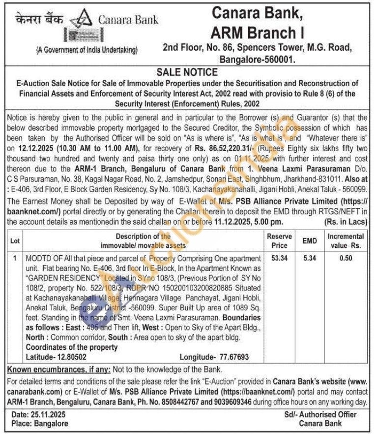 MODTD OF All that piece and parcel of Property Comprising One apartment unit. Flat bearing No. E-406, 3rd floor In E-Block, In the Apartment Known as "GARDEN RESIDENCY" Located in SYno 108/3, (Previous Portion of SY No 108/2, property No. 522/108/3, RDPR NO 150200103200820885 Situated at Kachanayakanahalli Village, Hennagara Village Panchayat, Jigani Hobli, Anekal Taluk, Bengaluru District-560099. Super Built Up area of 1089 Sq. feet. Standing in the name of Smt. Veena Laxmi Parasuraman. Boundaries as follows: East: 405 and Then lift, West: Open to Sky of the Apart Bldg., North: Common corridor, South: Area open to sky of the apart bldg.
