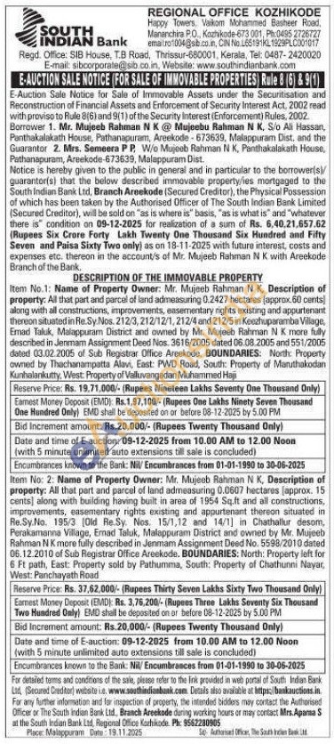 Description of property: All that part and parcel of land admeasuring 0.2427 hectares (approx.60 cents] along with all constructions, improvements, easementary rights existing and appurtenant thereon situated in Re. Sy Nos. 212/3, 212/12/1, 212/4 and 212/5 in Keezhuparamba Village, Emad Taluk, Malappuram District and owned by Mr. Mujeeb Rahman NK more fully described in Jenmam Assignment Deed Nos. 3616/2005 dated 06.08.2005 and 551/2005 dated 03.02.2005 of Sub Registrar Office Areekode, BOUNDARIES: North: Property owned by Thachanampatta Alavi, East: PWD Road, South: Property of Maruthakodan Kunhalankutty, West: Property of Valluvangadan Muhammed Haji