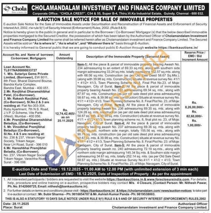 Item-1: All the piece & parcel of immovable property bearing Awash No. 234 admeasuring to an extent of 69.33 sq. mts, along with southern side margin admeasuring 33.24 sq.mts. totally measuring 102.57 sq.mts. along with 66.06 sq.mts. Construction (as per Old Sale Deed 58.67 Sq. Mts.), (along with 39.98 sq. mts. Construction) situate at revenue survey No. 41/1 +41/2+ 41/3, Town Planning Scheme No.8. Final Plot No.23, of Moje: Navagam, City of Surat. Item-2: All the piece & parcel of immovable property bearing Awash No. 235 admeasuring 69.34 sq. mts, along with 87.97 sq. mts. Construction (as per old sale deed plot area admeasuring 58.67 sq. mts. & 39.98 sq. mts. construction) Situate at revenue survey No. 41/1+41/2-41/3, Town Planning Scheme No. 8. Final Plot No. 23. of Moje: Navagam, City of Surat. Item-3; All the piece & parcel of immovable property bearing Awash No. 236 admeasuring 69.35 sq. mts, along with /- 124.28 sq. mts, construction (as per old sale deed plot area admeasuring 58.67 sq, mts. & 39.98 sq. mts. Construction) situate at revenue survey No. 41/141/2+41/3, town planning scheme no. 8, final plot no. 23, of Moje: Navagam, City of Surat Item-4: All the piece & parcel of immovable property bearing awash No. 237 admeasuring 69.36 sq. mts., along with 86.20 Sq.mts. northern side margin, totally 155.56 sq. mts, along with 90.75 sq. mts, construction (as per old sale deed plot area admeasuring 58.67 sq. mts. & 39.98 sq. mts. Construction) situate at revenue survey No. 41/141/2+41/3, Town Planning Scheme No. 8. Final Plot No. 23. of Moje: Navagam, City of Surat. Item-5: All the piece & parcel of immovable property bearing awash no. 240 admeasuring 72.19 sq.mts., along with northem side margin admeasuning 145.34 Sq.mts. & Southern side margin admeasuring 34.61 sq. mts, totally 252.14 sq. mts. (as per Old Sale Deed 58.67 sq. mts.) Situate at revenue Survey No.41/141/2 41/3, Town Planning Scheme No. 8, Final Plot No. 23. of Moje: Navagam, City of Surat.