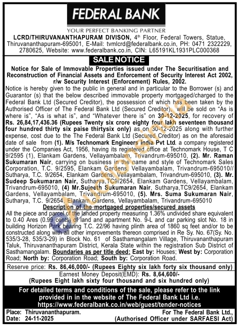 All the piece and parcel of the landed property measuring 1.36% undivided share equivalent to 0.40 Ares (0.99 cents) of land and apartment No. 9-L and car parking slot No. 18 in building Horizon Park bearing T.C. 22/96 having plinth area of 1860 sq feet and/or to be constructed along with all other improvements thereon comprised in Re Sy. No. 67(Sy. No. 535/3-28, 535/3-29) in Block No. 61 of Sasthamangalam Village, Thiruvananthapuram Taluk, Thiruvananthapuram District, Kerala State within the registration Sub District of Sasthamangalam. Boundaries as per title deed: East by: Houses; West by: Corporation Road; North by: Corporation Road; South by: Corporation Road.