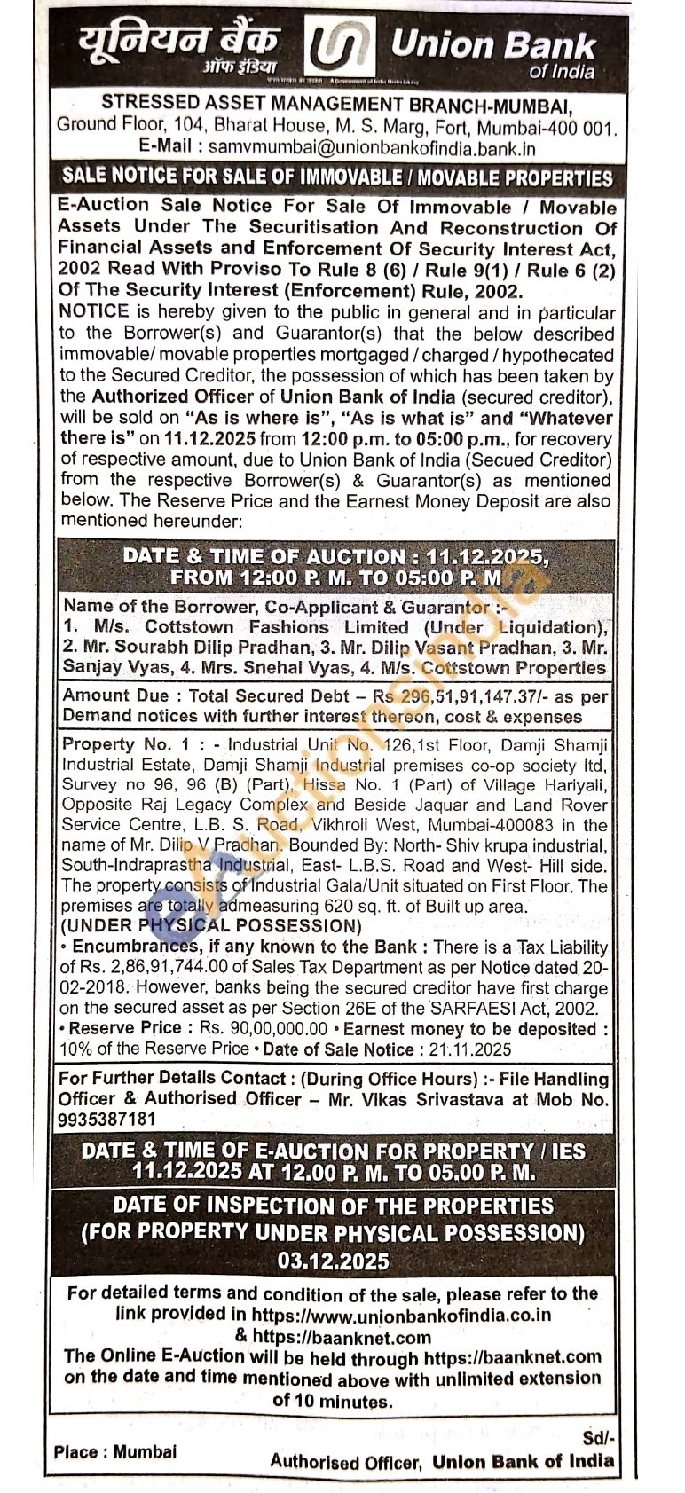 Property No. 1 Industrial Unit No. 126, 1st Floor, Damji Shamji Industrial Estate, Damji Shamji Industrial premises co-op society Itd, Survey no 96, 96 (B) (Part), Hissa No. 1 (Part) of Village Hariyali, Opposite Raj Legacy Complex and Beside Jaquar and Land Rover Service Centre, L.B. S. Road, Vikhroli West, Mumbai-400083 in the name of Mr. Dilip V Pradhan. Bounded By: North-Shiv krupa industrial, South-Indraprastha Industrial, East- L.B.S. Road and West- Hill side. The property consists of Industrial Gala/Unit situated on First Floor. The premises are totally admeasuring 620 sq. ft. of Built up area