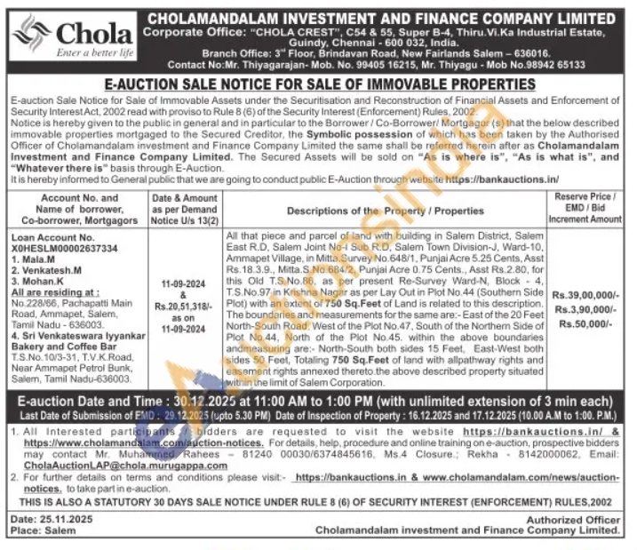 All that piece and parcel of land with building in Salem District, Salem East R.D. Salem Joint No-1 Sub R.D. Salem Town Division-J, Ward-10, Ammapet Village, in Mitta. Survey No. 648/1, Punjai Acre 5.25 Cents, Asst Rs.18.3.9., Mitta. S.No.684/2, Punjai Acre 0.75 Cents., Asst Rs.2.80, for this Old T.S.No.86, as per present Re-Survey Ward-N, Block 4, T.S.No.97 in Krishna Nagar as per Lay Out in Plot No.44 (Southern Side Plot) with an extent of 750 Sq. Feet of Land is related to this description The boundaries and measurements for the same are:-East of the 20 Feet North-South Road, West of the Plot No.47, South of the Northern Side of Plot No.44, North of the Plot No.45. within the above boundaries andmeasuring are: North-South both sides 15 Feet, East-West both sides 50 Feet, Totaling 750 Sq. Feet of land with allpathway rights and easement rights annexed thereto the above described property situated within the limit of Salem Corporation.