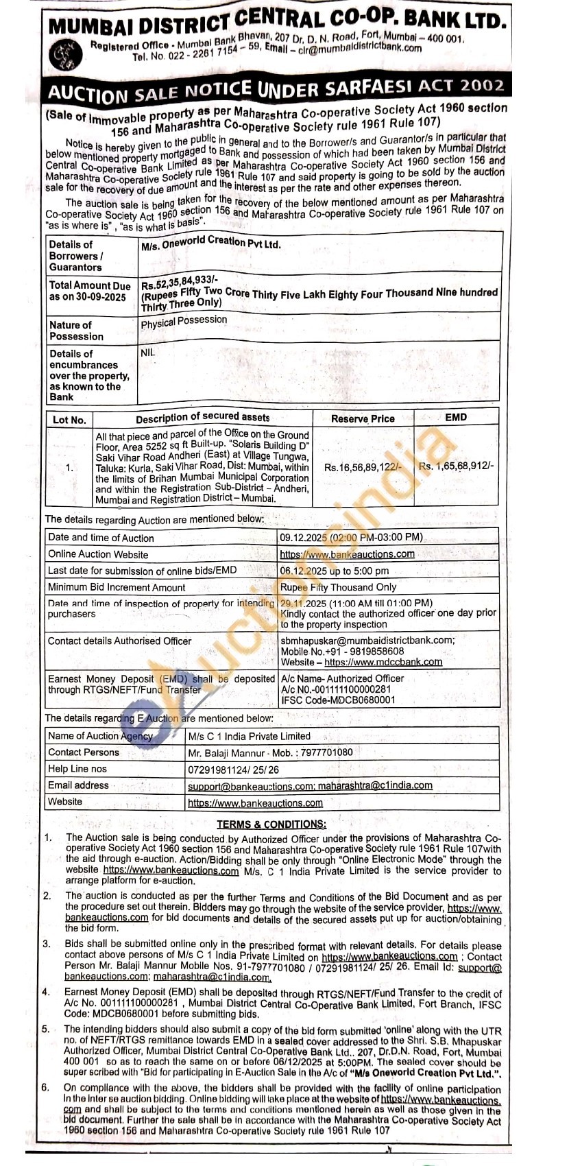 All that plece and parcel of the Office on the Ground Floor, Area 5252 sq ft Built-up. "Solaris Buliding D Saki Vihar Road Andheri (East) at Village Tungwa, Taluka: Kurla, Saki Vihar Road, Dist: Mumbai the limits of Brihan Mumbai Municipal Corporation and within the Registration Sub-District-Andheri, Mumbai and Registration District-Mumbal