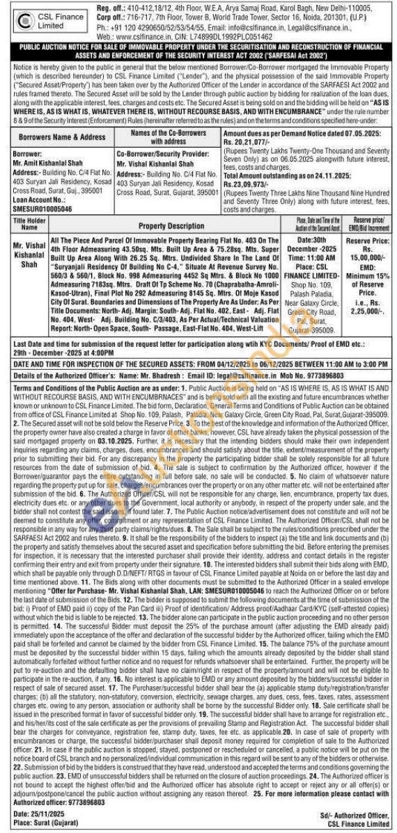 All The Piece And Parcel Of Immovable Property Bearing Flat No. 403 On The 4th Floor Admeasuring 43.50sq. Mts. Built Up Area & 75.28sq. Mts. Super Built Up Area Along With 26.25 Sq. Mtrs. Undivided Share In The Land Of "Suryanjali Residency Of Building No C-4," Situate At Revenue Survey No. 560/3 & 560/1, Block No. 998 Admeasuring 4452 Sq Mtrs. & Block No 1000 Admeasuring 7183sq. Mtrs. Draft Of Tp Scheme No. 70 (Chaprabatha-Amroli-Kasod-Utran), Final Plot No 292 Admeasuring 8145 Sq. Mtrs. Of Moje Kasod City Of Surat. Boundaries and Dimensions of The Property Are As Under: As Per Title Documents: North-Adj. Margin: South-Adj. Flat No. 402, East Adj. Flat No. 404. West Adj. Building No. C/3/403, As Per Actual/Technical Valuation Report: North-Open Space, South- Passage, East-Flat No. 404, West-Lift