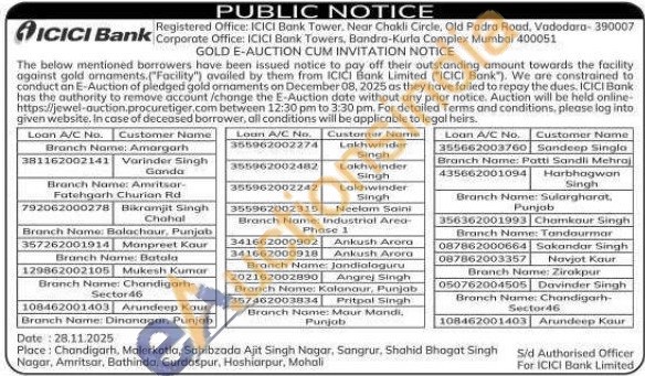 ICICI Bank Gold Auctions Auction in Ludhiana