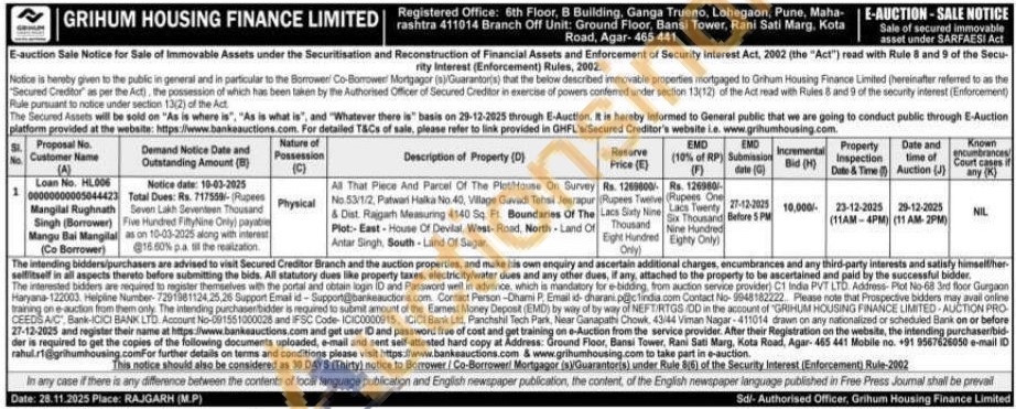 All That Piece And Parcel Of The Plot House On Survey No.53/1/2, Patwari Halka No.40, Village Gavadi Tehsil Jeerapur & Dist. Rajgarh Measuring 4140 Sq. Ft. Boundaries Of The Plot:-East-House Of Devilal, West-Road, North-Land Of Antar Singh, South - Land Of Sagar