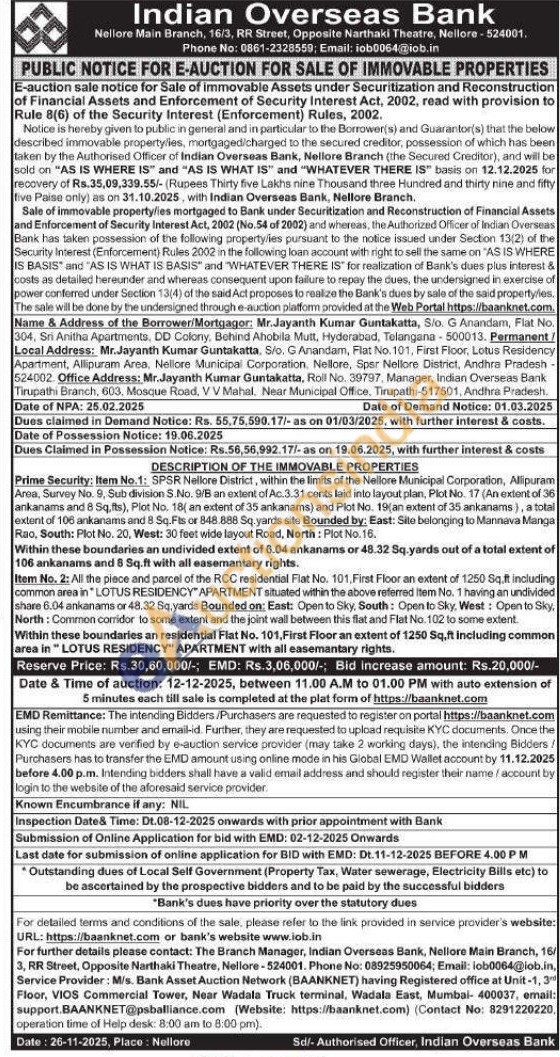 Prime Security: Item No.1: SPSR Nellore District, within the limits of the Nellore Municipal Corporation, Allipuram Area, Survey No. 9, Sub division S.No. 9/B an extent of Ac.3.31 cents laid into layout plan, Plot No. 17 (An extent of 36 ankanams and 8 Sq,fts), Plot No. 18( an extent of 35 ankanams) and Plot No. 19(an extent of 35 ankanams), a total extent of 106 ankanams and 8 Sq. Fts or 848.888 Sq.yards site Bounded by: East: Site belonging to Mannava Manga Rao, South: Plot No. 20, West: 30 feet wide layout Road, North: Plot No. 16.