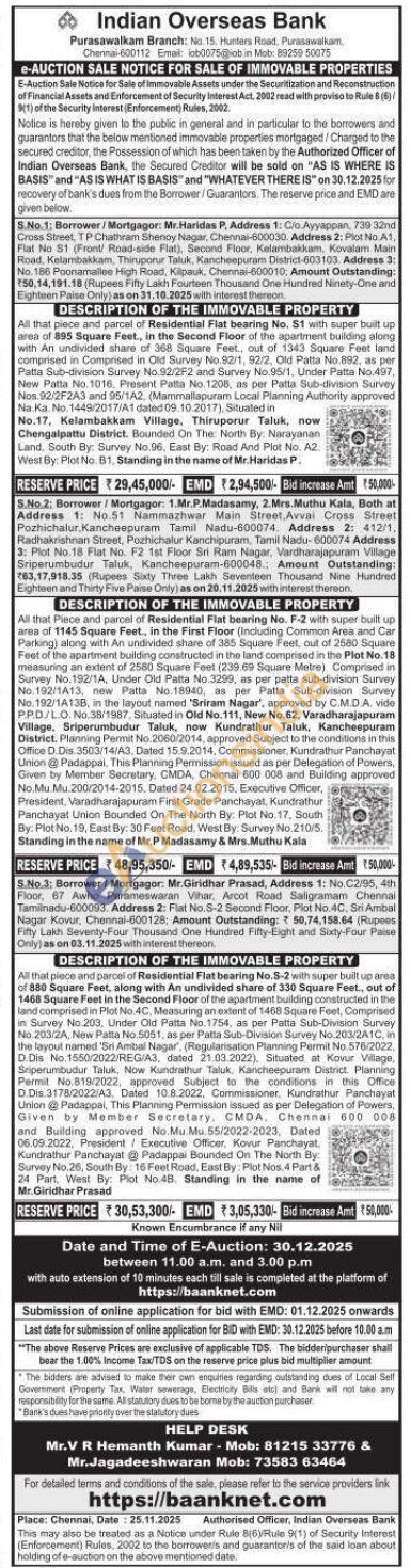 All that Piece and parcel of Residential Flat bearing No. F-2 with super built up area of 1145 Square Feet., in the First Floor (Including Common Area and Car Parking) along with An undivided share of 385 Square Feet, out of 2580 Square Feet of the apartment building constructed in the land comprised in the Plot No.18 measuring an extent of 2580 Square Feet (239.69 Square Metre) Comprised in Survey No. 192/1A, Under Old Patta No.3299, as per patta sub-division Survey No.192/1A13, new Patta No.18940, as per Patta Sub-division Survey No. 192/1A13B, in the layout named 'Sriram Nagar', approved by C.M.D.A. vide P.P.D/L.O. No.38/1987, Situated in Old No.111, New No.62, Varadharajapuram Village, Sriperumbudur Taluk, now Kundrathur Taluk, Kancheepuram District. Planning Permit No.2060/2014, approved Subject to the conditions in this Office D.Dis 3503/14/A3, Dated 15.9.2014, Commissioner, Kundrathur Panchayat Union @ Padappal, This Planning Permission issued as per Delegation of Powers, Given by Member Secretary, CMDA, Chennai 600 008 and Building approved No. Mu. Mu.200/2014-2015, Dated 24.02.2015. Executive Officer, President, Varadharajapuram First Grade Panchayat, Kundrathur Panchayat Union Bounded On The North By: Plot No. 17, South By: Plot No. 19, East By: 30 Feet Road, West By: Survey No.210/5. Standing in the name of Mr.P Madasamy & Mrs.Muthu Kala