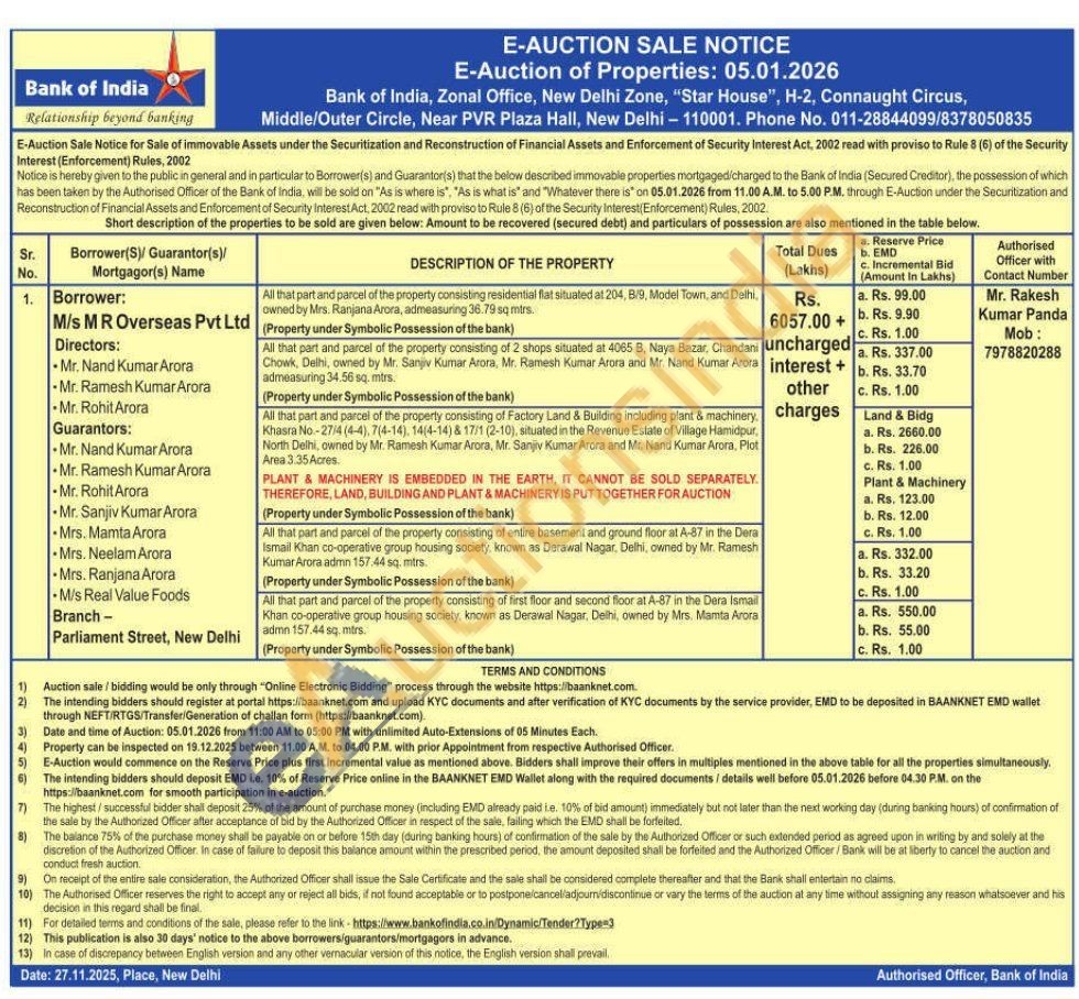 All that part and parcel of the property consisting of Factory Land & Building including plant & machinery, Khasra No-27/4 (4-4), 7(4-14), 14(4-14) & 17/1 (2-10), situated in the Revenue Estate of Village Hamidpur, North Delhi, owned by Mr. Ramesh Kumar Arora, Mr. Sanjiv Kumar Arora and Mr. Nand Kumar Arora, Plot Area 3.35 Acres