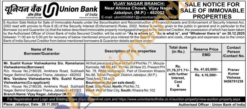 All that piece and parcel of Part of Plot No.71, Mouza-No. 78, RNM Maharajpur, Part of Diversion Khasra No.88, Tehsil-Panagar, District-Jabalpur, (M.P.). Karmeta, NB No.497, PH No.26 New 23, Present PH Total Area 735 sq.ft. Boundaries (As per sale deed): East: Side Road, North: Plot No. 72, West: Wall of Star City, South: Khasra No. 102