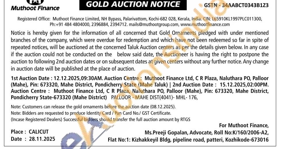 Muthoot Finance Ltd Gold Auctions Auction in Calicut