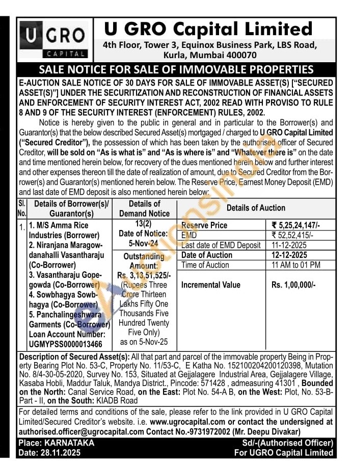 Description of Secured Asset(s): All that part and parcel of the immovable property Being in Prop-erty Bearing Plot No. 53-C, Property No. 11/53-C, E Katha No. 152100204200120398, Mutation No. 8/4-30-05-2020, Survey No. 153, Situated at Gejjalagere Industrial Area, Gejjalagere Village, Kasaba Hobli, Maddur Taluk, Mandya District., Pincode: 571428, admeasuring 41301, Bounded on the North: Canal Service Road, on the East: Plot No. 54-A B, on the West: Plot, No. 53-B-Part-II, on the South: KIADB Road