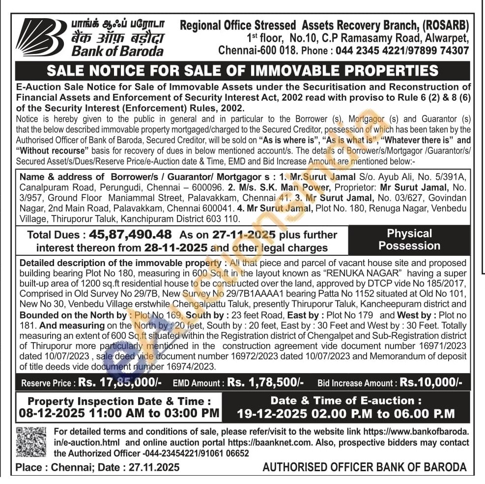 Detailed description of the immovable property: All that piece and parcel of vacant house site and proposed building bearing Plot No 180, measuring in 600 Sq.ft in the layout known as "RENUKA NAGAR" having a super built-up area of 1200 sq.ft residential house to be constructed over the land, approved by DTCP vide No 185/2017, Comprised in Old Survey No 29/7B, New Survey No 29/7B1AAAA1 bearing Patta No 1152 situated at Old No 101, New No 30, Venbedu Village erstwhile Chengalpattu Taluk, presently Thiruporur Taluk, Kancheepuram district and Bounded on the North by: Plot No 169, South by: 23 feet Road, East by: Plot No 179 and West by: Plot no 181. And measuring on the North by: 20 feet, South by: 20 feet, East by: 30 Feet and West by: 30 Feet. Totally measuring an extent of 600 Sq.ft situated within the Registration district of Chengalpet and Sub-Registration district of Thiruporur more particularly mentioned in the construction agreement vide document number 16971/2023 dated 10/07/2023, sale deed vide document number 16972/2023 dated 10/07/2023 and Memorandum of deposit of title deeds vide document number 16974/2023.