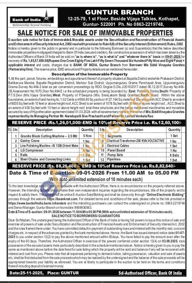 Granite Block Cutting Machine - 2.5 Mtr 5 Nos 7 Segments 1 Set 2 Gantry Crane 1 No 8 Electrical Transformer-250 KVA; VOLTACTIVE 1 No 3 Line Polishing Machine-IX 1300; Orient Make 1 No 9 Electrical Cables 1 Set 4 LG Compressor 1 No 10 Panel Board 1 No 5 Rails 1 Set 11 Pump Sets 6 Sets 6 Steel Chains and Connecting Links 1 Set 12 Pipelines 1 Set