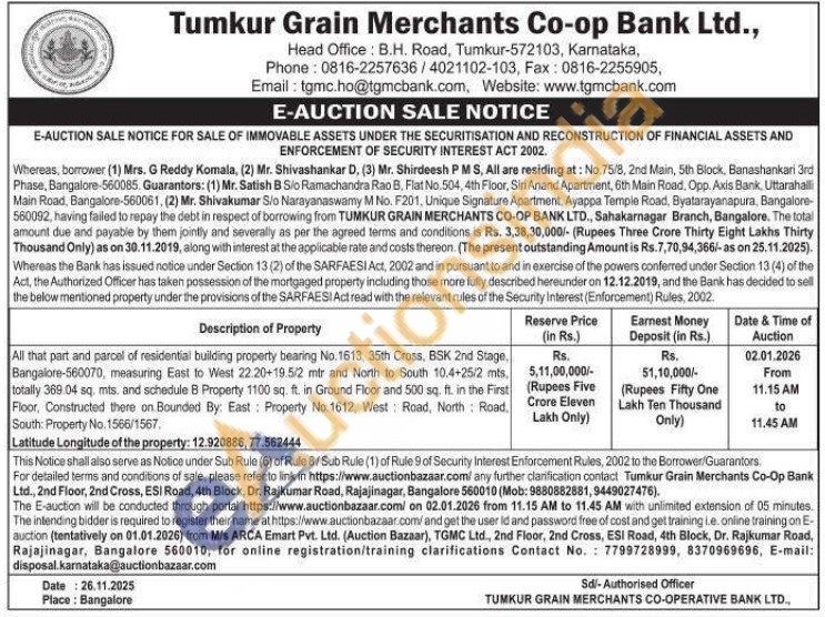 All that part and parcel of residential building property bearing No. 1613, 35th Cross, BSK 2nd Stage, Bangalore-560070, measuring East to West 22.20+19.5/2 mtr and North to South 10.4+25/2 mts, totally 369.04 sq. mts, and schedule B Property 1100 sq. ft. in Ground Floor and 500 sq. ft. in the First Floor, Constructed there on. Bounded By: East Property No. 1612, West Road, North Road, South: Property No. 1566/1567.\