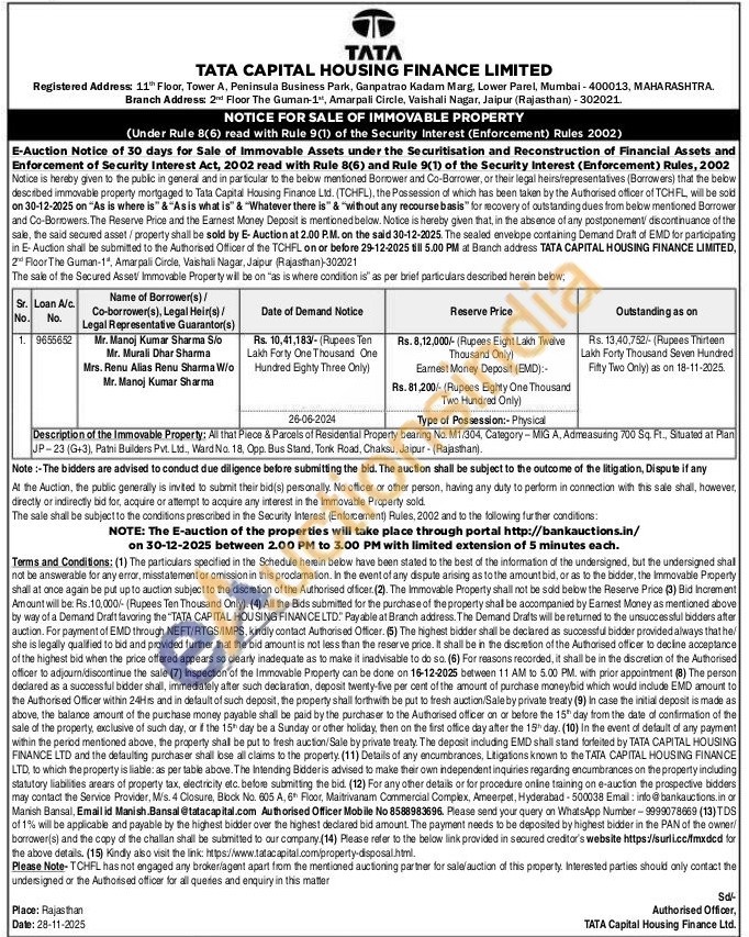 Description of the Immovable Property: All that Piece & Parcels of Residential Property bearing No. M1/304, Category-MIG A, Admeasuring 700 Sq. Ft., Situated at Plan JP-23 (G+3), Patni Builders Pvt. Ltd., Ward No. 18, Opp Bus Stand, Torik Road, Chaksu, Jaipur - (Rajasthan)