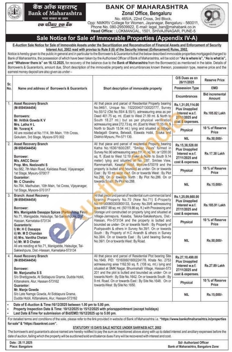 1)All that piece and parcel of Residential Property bearing No.946/1. Unique No. 152200407130020777, Survey No. 55/12 (Old No.55/4 & 55/1), admeasuring area as per Deed 401.75 sq. mt. (East to West 21.99 mt. & North to South 18.27 mt) but as per physical verification admeasuring area 272.73 sq. mt. (East to West 17.55 mt. & North to South 15.54 mt) lying and situated at Village-Madagalli Grama, Belwadi, Elawala Hobli, Taluka and District-Mysuru, Pin-571 130.