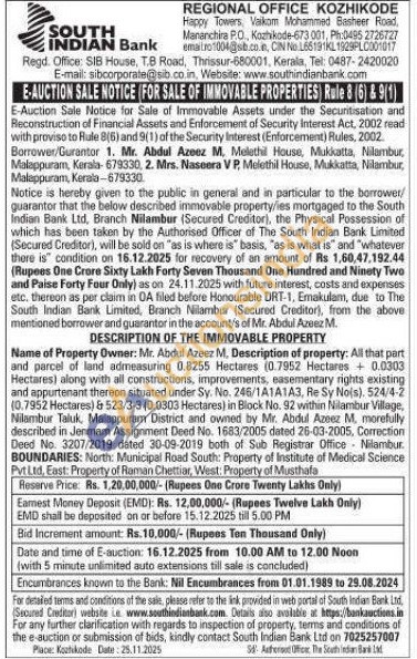 DESCRIPTION OF THE IMMOVABLE PROPERTY : Name of Property Owner: Mr. Abdul Azeez M, Description of property: All that part and parcel of land admeasuring 0.8255 Hectares (0.7952 Hectares + 0.0303 Hectares) along with all constructions, improvements, easementary rights existing and appurtenant thereon situated under Sy. No. 246/1A1A1A3, Re Sy No(s), 524/4-2 (0.7952 Hectares) & 523/3-3 (0.0303 Hectares) in Block No. 92 within Nilambur Village, Nilambur Taluk, Malappuram District and owned by Mr. Abdul Azeez M. morefully described in Jenmam Assignment Deed No. 1683/2005 dated 26-03-2005, Correction Deed No. 3207/2019 dated 30-09-2019 both of Sub Registrar Office Nilambur BOUNDARIES: North: Municipal Road South: Property of Institute of Medical Science Pvt Ltd, East: Property of Raman Chettiar, West: Property of Musthafa