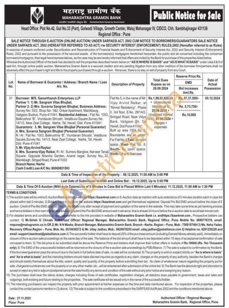 Flat No 5, in the name of Mr. Vijay Arvind Raikar, at "Nirmal Residency", Phase II, 3rd floor, S.No. 29/1A/2. Sinhgad Road, Near Vidya Bank, Vadgaon Bk, Tal Havelli, Dist Pune 411041. Built up area 1004 Sq. ft. Boundaries are as under. For Flat No. 5 East-By open space, West- Flat No. 6. South By open space, North-Lift and Staircase Rs.1,98,82,028.45 + Unrecovered interest up to 26.09.2024+ Unapplied Interest we.f. 01.09.2024+ charges expenses Rs. 5,73,750/- Rs.10,000 5. Mr. Vijay Arvind Raykar 6. Mrs. Suvarna Vijay Raikar, R/At: Sumeru Banglow, Narveer Tanaji Square. Opposite Bramha Garden, Anand nagar, Survey No. 33,