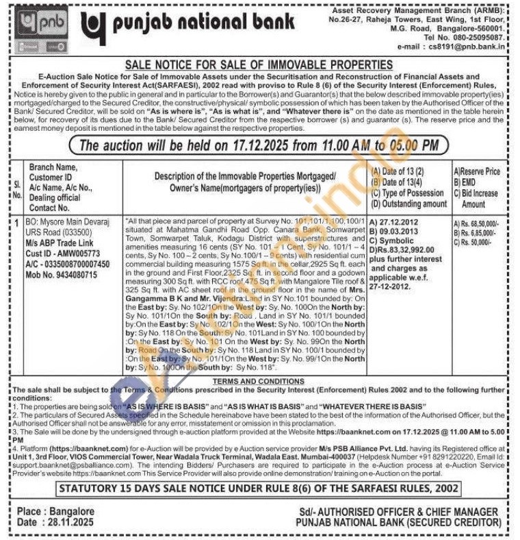 All that piece and parcel of property at Survey No. 101,101/1,100,100/1 situated at Mahatma Gandhi Road Opp. Canara Bank, Somwarpet Town, Somwarpet Taluk, Kodagu District with superstructures and amenities measuring 16 cents (SY No. 101-1 Cent, Sy No. 101/1-4 cents, Sy No. 100-2 cents, Sy No. 100/1-9 cents) with residential cum commercial building measuring 1575 Sq ft. in the cellar 2925 Sq ft. each in the ground and First Floor. 2325 Sq. ft. in second floor and a godown measuring 300 Sq ft. with RCC roof, 475 Sq ft. with Mangalore Tile roof & 325 Sq ft. with AC sheet roof in the ground floor in the name of Mrs. Gangamma BK and Mr. Vijendra:Land in SY No.101 bounded by: On the East by: Sy. No 102/10n the West by: Sy. No. 1000n the North by: Sy No. 101/10n the South by: Road. Land in SY No. 101/1 bounded by:On the East by: Sy No. 102/10n the West: Sy No. 100/1On the North by: Sy No. 118 On the South: Sy No. 101 Land in SY No. 100 bounded by On the East by: Sy No. 101 On the West by: Sy. No. 990n the North by: Road On the South by: Sy No. 118 Land in SY No. 100/1 bounded by On the East by: Sy No. 101/10n the West by: Sy. No. 99/1On the North by: Sy No. 1000n the South by: Sy No. 118