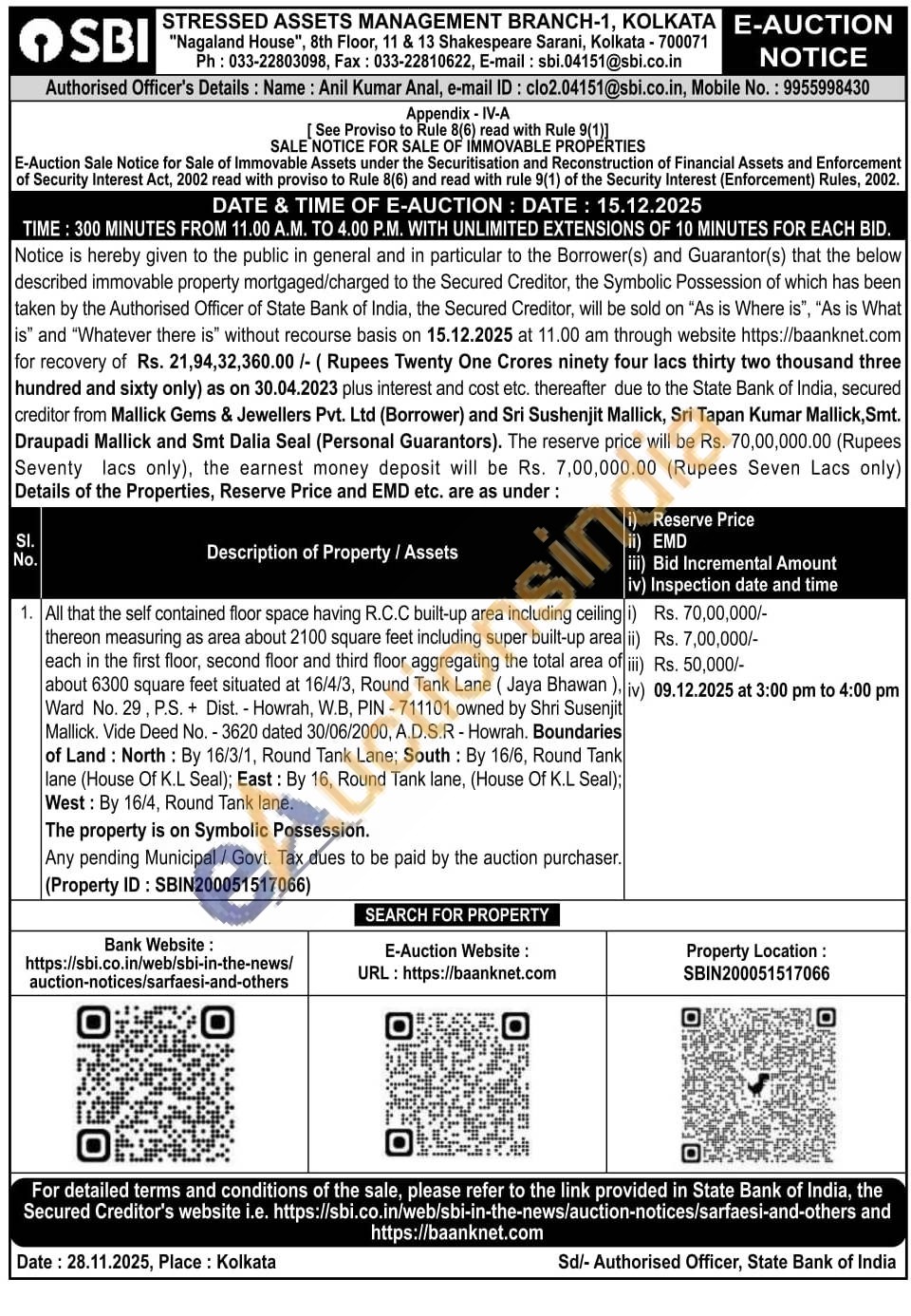 All that the self contained floor space having R.C.C built-up area including ceiling i) thereon measuring as area about 2100 square feet including super built-up area ii) each in the first floor, second floor and third floor aggregating the total area of iii) about 6300 square feet situated at 16/4/3, Round Tank Lane (Jaya Bhawan), iv) Ward No. 29, P.S. + Dist. Howrah, W.B, PIN-711101 owned by Shri Susenjit Mallick, Vide Deed No. - 3620 dated 30/06/2000, A.D.S.R - Howrah. Boundaries of Land: North: By 16/3/1, Round Tank Lane; South: By 16/6, Round Tank lane (House Of K.L Seal); East: By 16, Round Tank lane, (House Of K.L Seal); West: By 16/4, Round Tank lane.
