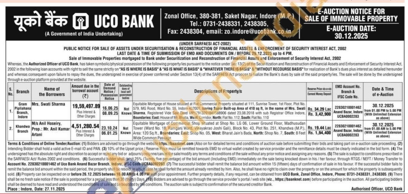 Equitable Mortgage of Commercial Shop situated at Shop No. LG 06, Lower Ground Floor, Madhusudan Tower (Ward No. 18, Ramganj Ward, Vinayakrao Joshi Gall), Block No. 43, Plot No. 251, Khandwa (M.P.). Known Area: 120 Sq ft., Boundaries: East: Shop No. 05, West: Bharat Jain's Bada, North: Shop No. 7, South: 8 Feet Wide Common Passage