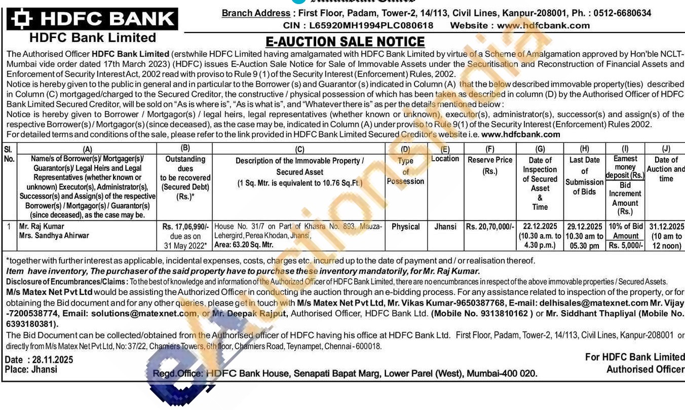 House No. 31/7 on Part of Khasra No. 893, Mauza Lehergird, Perea Khodan, Jhansi, Area: 63.20 Sq. Mtr.