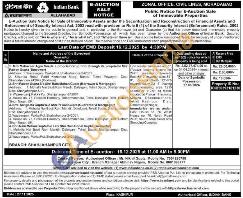 One residential house no. 77. (Topaz), bearing khasra no. 242m, measuring towards East 54-0, towards West 54- 0", towards North 22'-6"& towards south 22"-6", having total measuring area 1215 sq.feet or 112.91 sq meter. situated at Prakash Harmony. Distt. Mouza, Dheemarkheda. tehsil Kashipur Udhamsingh Nagar