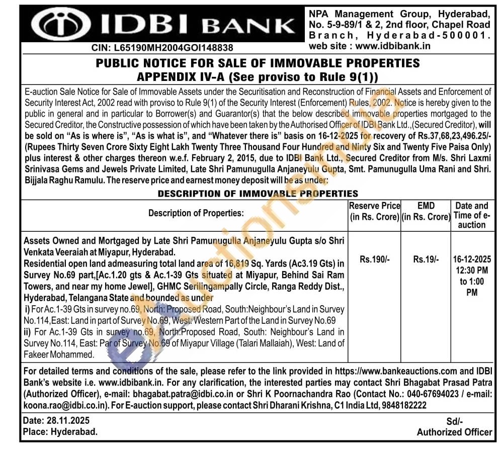 Residential open land admeasuring total land area of 16,819 Sq. Yards (Ac3.19 Gts) in Survey No.69 part, [Ac.1.20 gts & Ac.1-39 Gts situated at Miyapur, Behind Sai Ram Towers, and near my home Jewel], GHMC Serilingampally Circle, Ranga Reddy Dist., Hyderabad, Telangana State and bounded as under