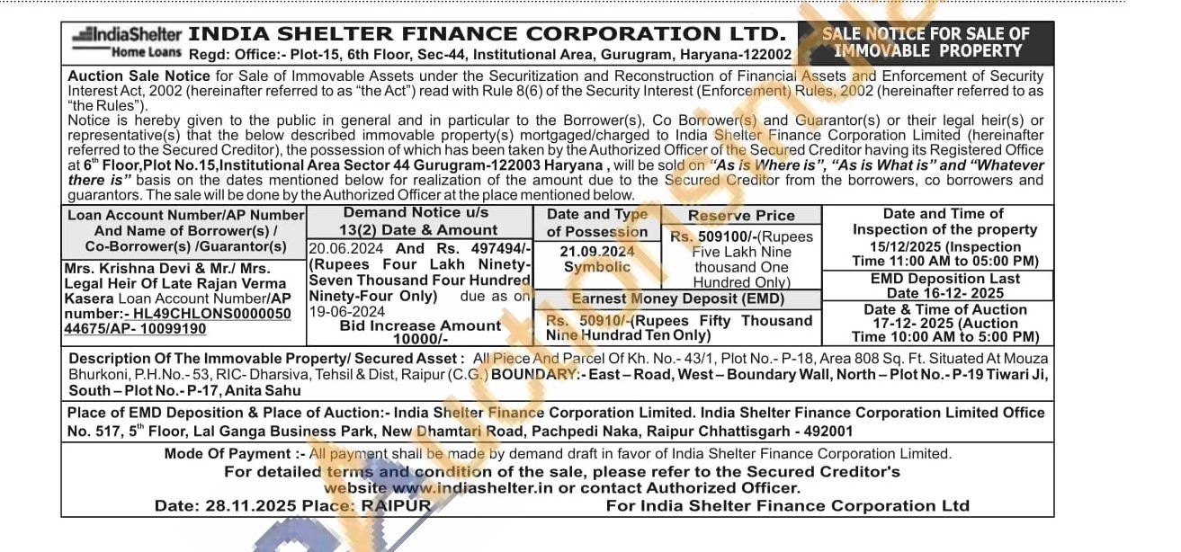 Description Of The Immovable Property/Secured Asset: All Piece And Parcel Of Kh. No.-43/1, Plot No.-P-18, Area 808 Sq. Ft. Situated At Mouza Bhurkoni, P.H.No.-53, RIC-Dharsiva, Tehsil & Dist, Raipur (C.G.) BOUNDARY:-East-Road, West-Boundary Wall, North-Plot No.-P-19 Tiwari Ji, South-Plot No.- P-17, Anita Sahu