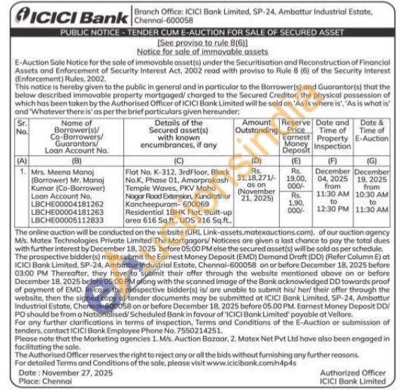 Fiat No. K-312, 3rd Floor, Block No.K. Phase 01, Amarprakash Temple Waves, PKV Maha Nagar Road Extension, Kundrathur Kancheepuram-600069 Residential 1BHK Flot, Built-up area 616 Sq.ft. UDS 216 Sq.ft