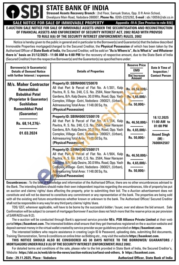 All that Part & Parcel of Flat No. A-1/904, Kalp Pavitra, R. S. No. 248, C.S. No. 2584, Near Narayan Gardens, B/h. Kalp Desire, 30.0 Mts. Road, Opp. Yash Complex, Village-Gotri, Vadodara - 390021, (Urban), Admeasuring Total Area: 1148.00 Sq. fts. (Physical Possession)