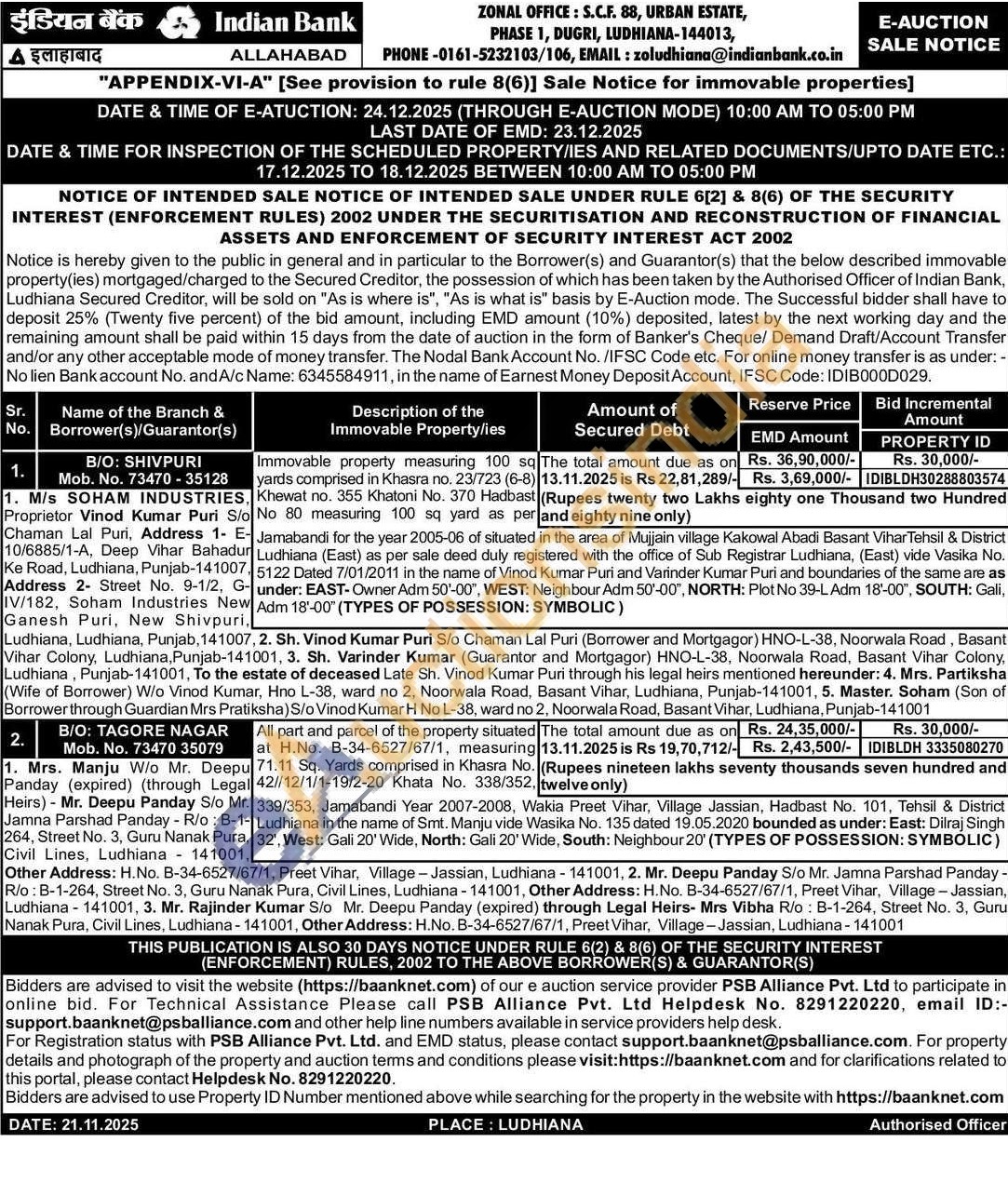 situated 339/353, Jamabandi Year 2007-2008, Wakia Preet Vihar, Village Jassian, Hadbast No. 101, Tehsil & District Ludhiana in the name of Smt. Manju vide Wasika No. 135 dated 19.05.2020 bounded as under: East: Dilraj Singh 32', West: Gali 20' Wide, North: Gali 20' Wide, South: Neighbour 20' (TYPES OF POSSESSION: SYMBOLIC