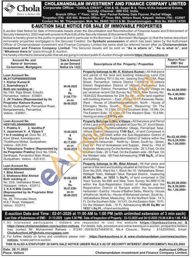 1) All that piece and parcel of the land and building measuring Land 234 Sq.mtr., Building 791% Sq.mtr., bearing Door No. 1/64, Raja Street, Pernambut, Vellore District 635810, In Vellore District Registration District of Vellore, Pernambut Sub Registration District, Pernambut Taluk, Erikuthy Village as per revenue record Old Survey No. 162A, New Survey No. 162A/222 Boundaries for 234 Sq.mtr., of the land together with building thereon:- East: House of T.P.Kesavalu Naidu, West House of UthariNagaraj Mandiri, North House of Ethirajalu Naidu, South Street, Measuring: On The Northern Side: 15.2 Mtr, On The Southern Side: 15 Mtr, On The Eastern Side: 15.4 Mtr, On The Western Side: 15.6 Mir, Having an area of 234 Sq.mtr.