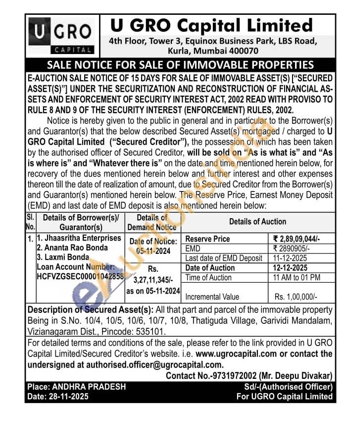 Description of Secured Asset(s): All that part and parcel of the immovable property Being in S.No. 10/4, 10/5, 10/6, 10/7, 10/8, Thatiguda Village, Garividi Mandalam, Vizianagaram Dist., Pincode: 535101.