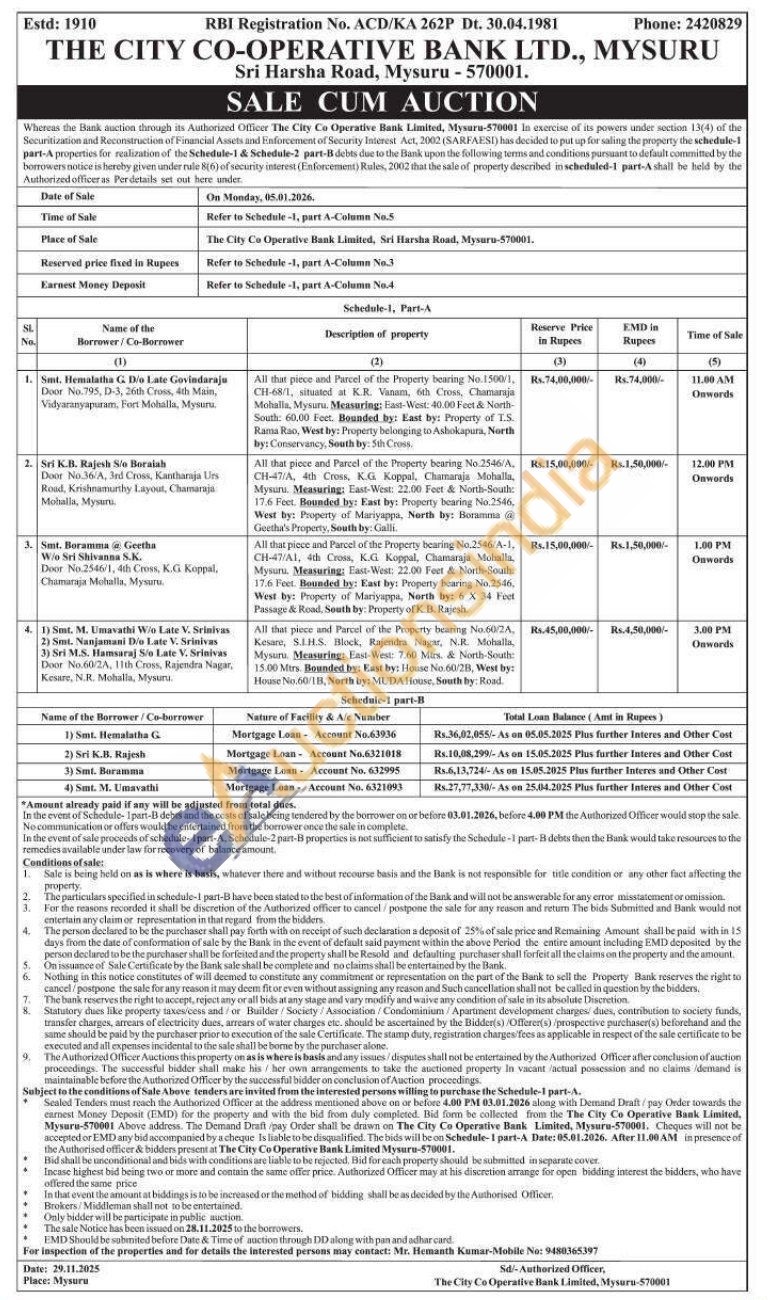 3) All that piece and Parcel of the Property bearing No.2546/A-1, CH-47/A1, 4th Cross, K.G. Koppal, Chamaraja Mohalla, Mysuru. Measuring: East-West: 22.00 Feet & North-South 17.6 Feet. Bounded by: East by: Property bearing No. 2546, West by: Property of Mariyappa, North by: 6 X 34 Feet Passage & Road. South by: Property of K. B. Rajesh