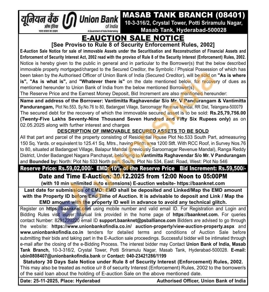 All that part and parcel of the property consisting of Residential House Plot No.533 South Part, admeasuring 150 Sq. Yards. or equivalent to 125.41 Sq. Mtrs., having Plinth area 1200 Stft. With RCC Roof, in Survey Nos.76 to 80, situated at Badangpet Village, Balapur Mandal (previously Saroornagar Revenue Mandal), Ranga Reddy District, Under Badangpet Nagara Panchayat, belonging to Vantimitta Raghavendar S/o Mr. V Pandurangam and Bounded by: North: Plot No 533 North part, South: Plot No 534, East: Road, West: Plot No 546