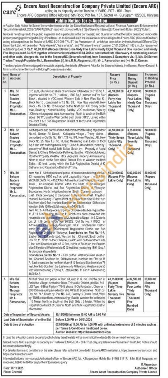 contact Authorised officer of Encore ARC Mr. K Nagendran Mobile No. 91762 91717, & Mr B.M. Nagaraju, on mobile no. 8384074164