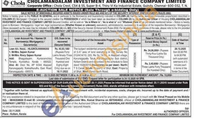 The subject residential property comprises an extent of 5.47 ares of land everything in Old Survey No 213/A/14/10, 223, Re Sy 74/3/2, in Alappad village. Karunagapally Taluk, Karunagapakky Sub district, Kollam District and described in the schedule to Sale deed 1508/2019. Boundaries as per deed:- North: TS Canal, South: Property of Shijil, East: Property of Shel. West: Panchayath Road.