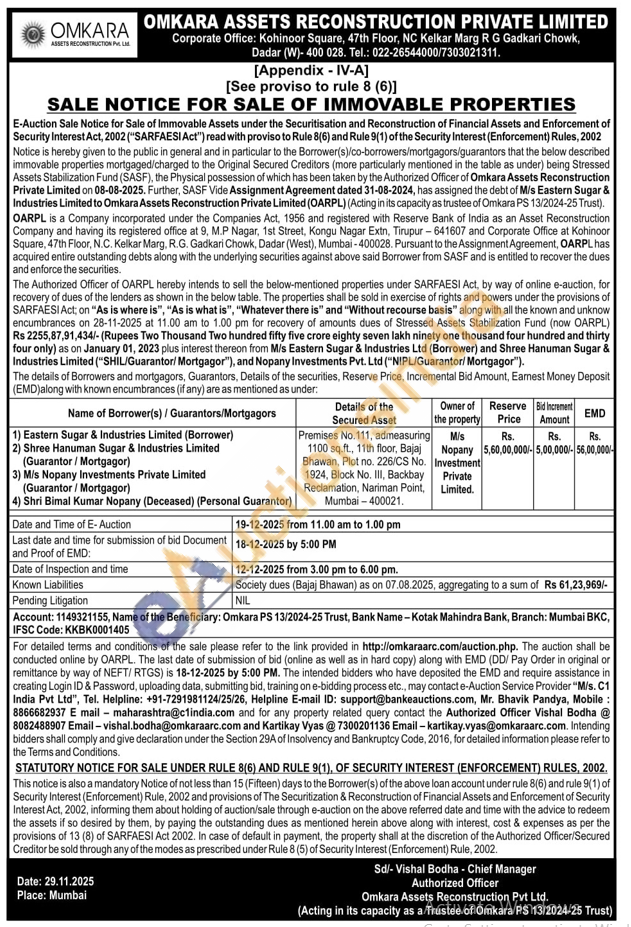 Contact Authorized Officer Vishal Bodha @ 8082488907 Email-vishal.bodha@omkaraarc.com and Kartikay Vyas @ 7300201136 Email-kartikay.vyas@omkaraarc.com