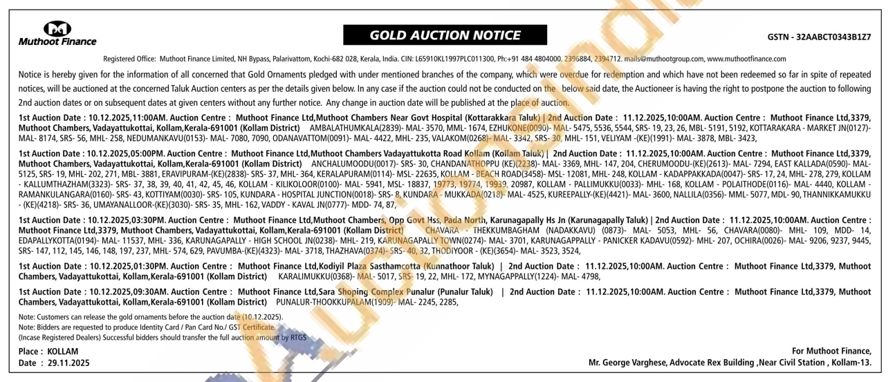 Muthoot Finance Ltd Gold Auctions Auction in Kollam