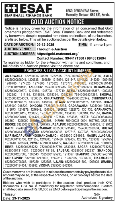 ESAF SMALL FINANCE BANK Gold Auctions Auction in Bhopal